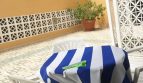El apartamento, situado en una planta baja, tiene una superficie de 50 m2 más una terraza de 7 m2 y se distribuye en vestíbulo, cocina abierta con barra americana, salón comedor con acceso a una amplia terraza, un dormitorio con cama matrimonial y armarios empotrados y una zona adaptada como dormitorio con cama individual.
